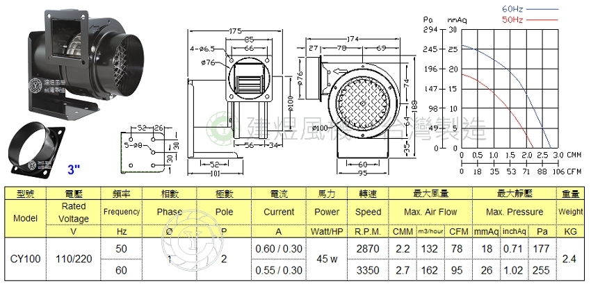 建煜多翼式抽送風機 CY100