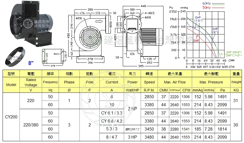 建煜多翼式抽送風機 CY200-前傾式多翼式送風機 - 2HP/3HP - 2極