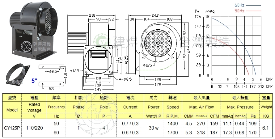 建煜多翼式送風機 CY125P-前傾式多翼式風機 - 30W - 4極
