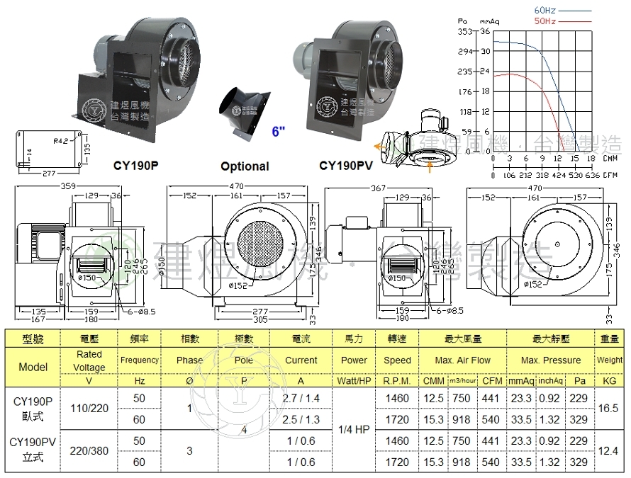 建煜多翼式送風機 CY190P&PV-前傾式多翼式風機 - 1/4HP - 4極