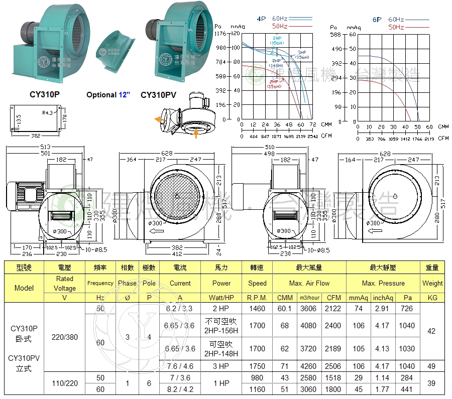 建煜多翼式送風機 CY310P CY310PV-前傾式多翼式風機 - 2HP/3HP/1HP - 4極/6極